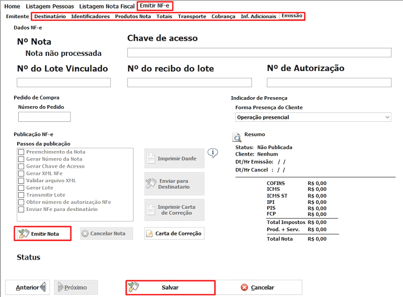 2º Abra a tela de NFe, clique em NOVA > Escolha o DESTINATÁRIO > Tipo da Nota e Natureza da Operação > Inclua os itens na Nota > Verifique os TOTAIS > Escolha a Transportadora e ou o Tipo de frete > Informações adicionais caso hajam aparecerão, se não pode incluir > Emissão basta conferir > SALVAR e clicar em EMITIR NOTA.