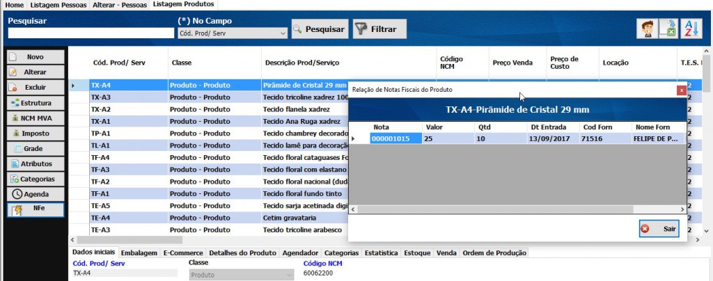 A partir de outra tela, também é facil ver todos os fornecedores deste produto e também as últimas notas fiscais.