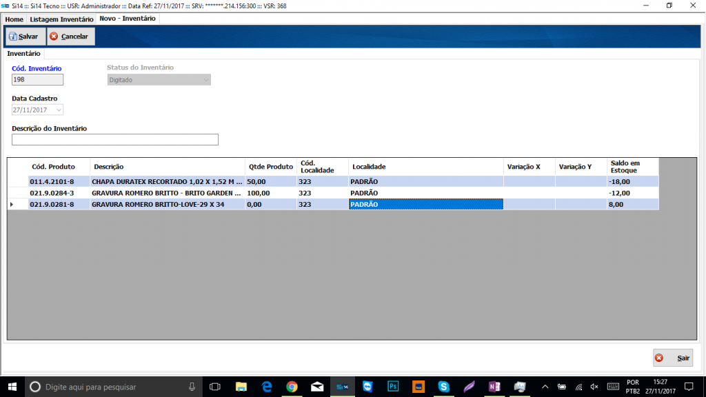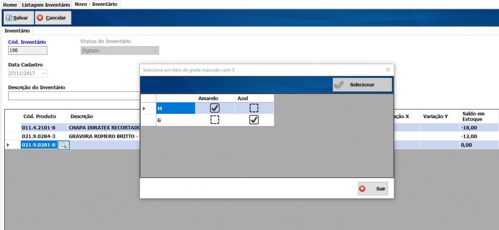Veja abaixo que no momento de inventariar a tela é intuitiva, fácil de utilizar, pois só é necessário informar os produtos e as suas quantidades atuais. Tudo bem objetivo.