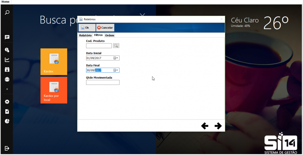 Veja abaixo a simulação de um relatório Kardex baseado em suas datas de movimentação, além disso você também poderá escolher se quer ver todos os produtos ou de algum específico.