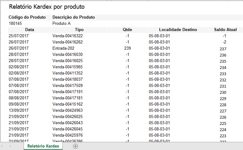 O relatório de kardex mostra toda movimentação dos produtos no estoque: quantidade inicial, compras realizadas, vendas realizadas, entradas, saídas e quantidade atual em estoque.