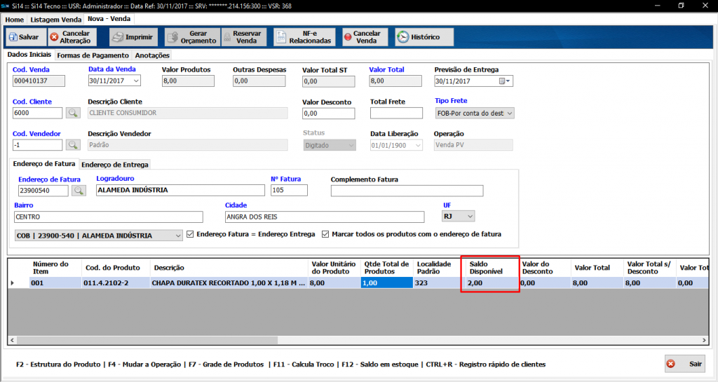 Mais claro, no momento da digitação da venda é também informado o saldo atual do produto e desta forma tudo fica mais prático.