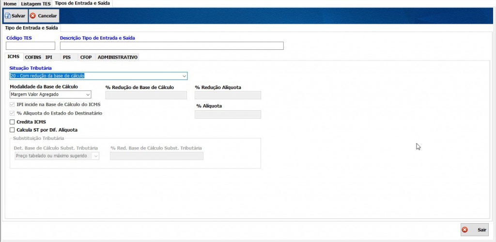 O TES – Tipo de Entrada e Saída é responsável pela correta aplicação dos impostos devidos por ocasião da entrada e saída dos produtos, controle de baixa de estoque, duplicatas e outros. Abaixo a tela de cadastro de TES, nessa tela