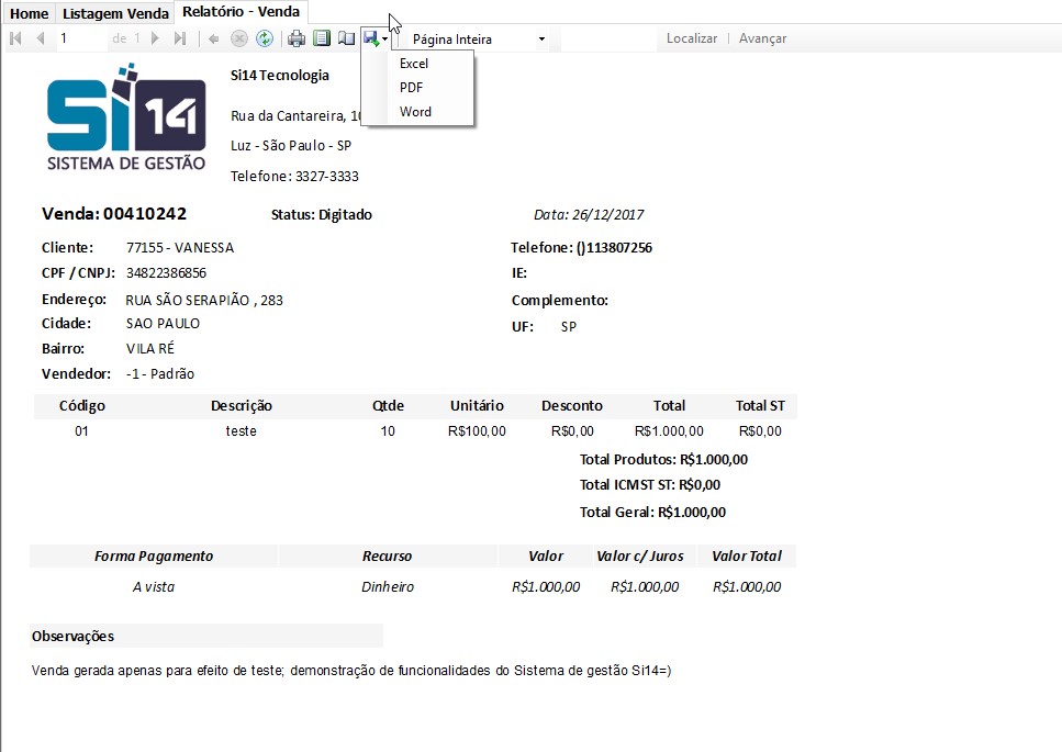 Nessa tela temos a possibilidade de imprimir, seja para enviar por e-mail para a conferência, mandar para outro departamento da empresa, tendo também a opção de exportar ara Excel, PDF, Word, conforme necessidade; podendo acrescentar observações pertinentes à venda, ou até mesmo informações adicionais que necessitem sair na NF-e: