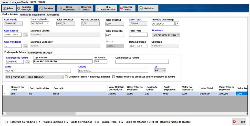 Venda direta é a mais completa, nessa tela também é possível gerar orçamento e reservar produto, mandar para separação quando houver necessidade, mas facilmente também pode-se selecionar forma de pagamento e finalizar venda já escolhendo opção de emitir Nota fiscal da venda ou cupom como o vendedor preferir.